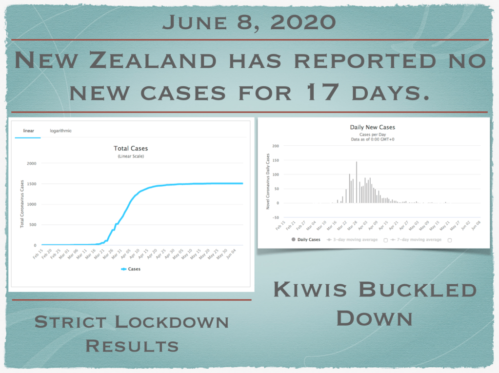 With no new cases for 17 days, there is certainly reason to be encouraged that New Zealand took the correct path and difficult steps to contain the spread. Lockdown is not easy. Individual freedoms are squelched, but only temporarily.