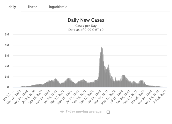 At the time of this first writing, March 24, 2020, the virus was nearing 400,000 detectable cases worldwide and nearly 20,000 deaths. Over three years later, in July 2023, there are 1660 times as many cases and the infection rates continue to ebb and flow.